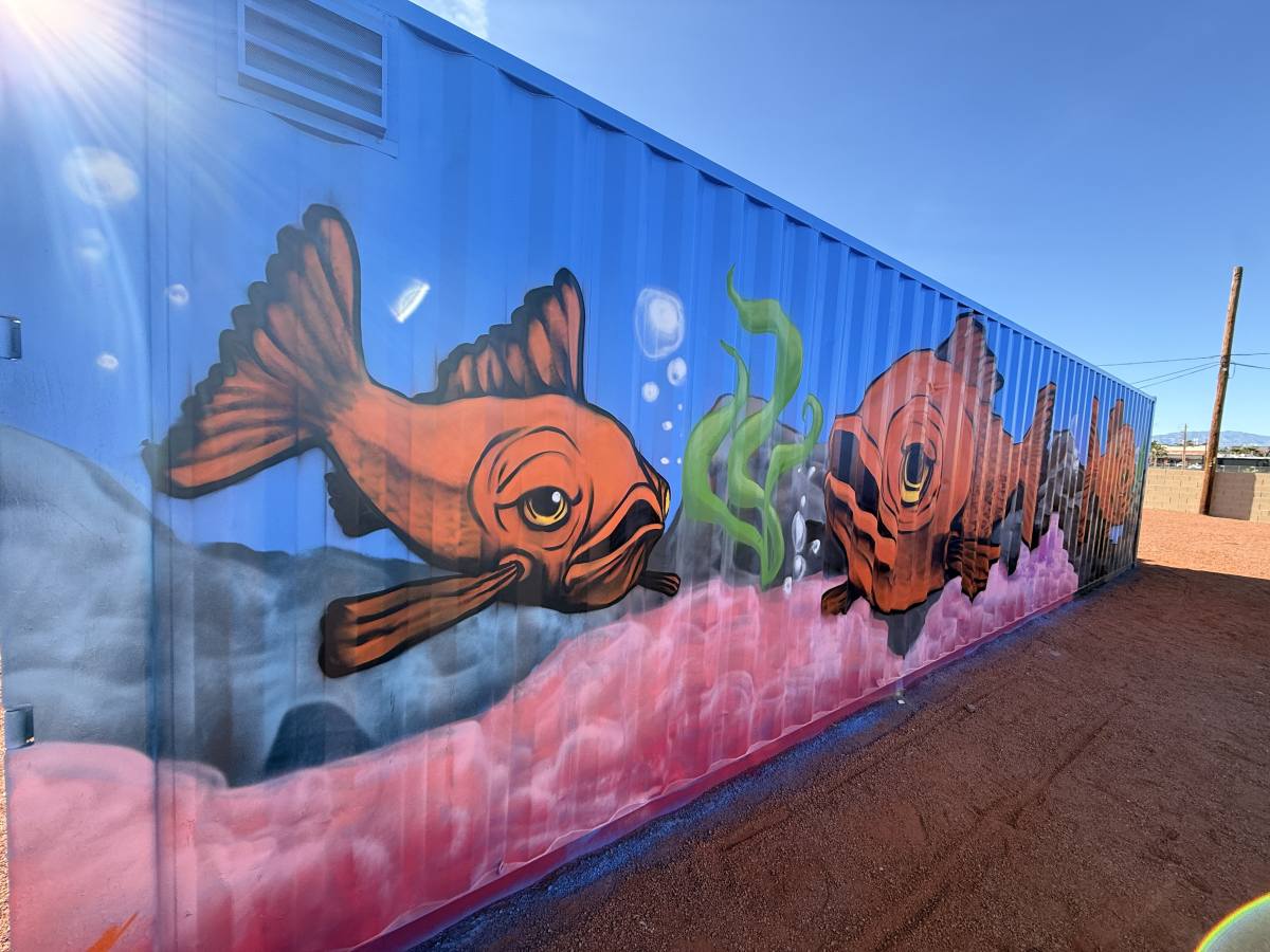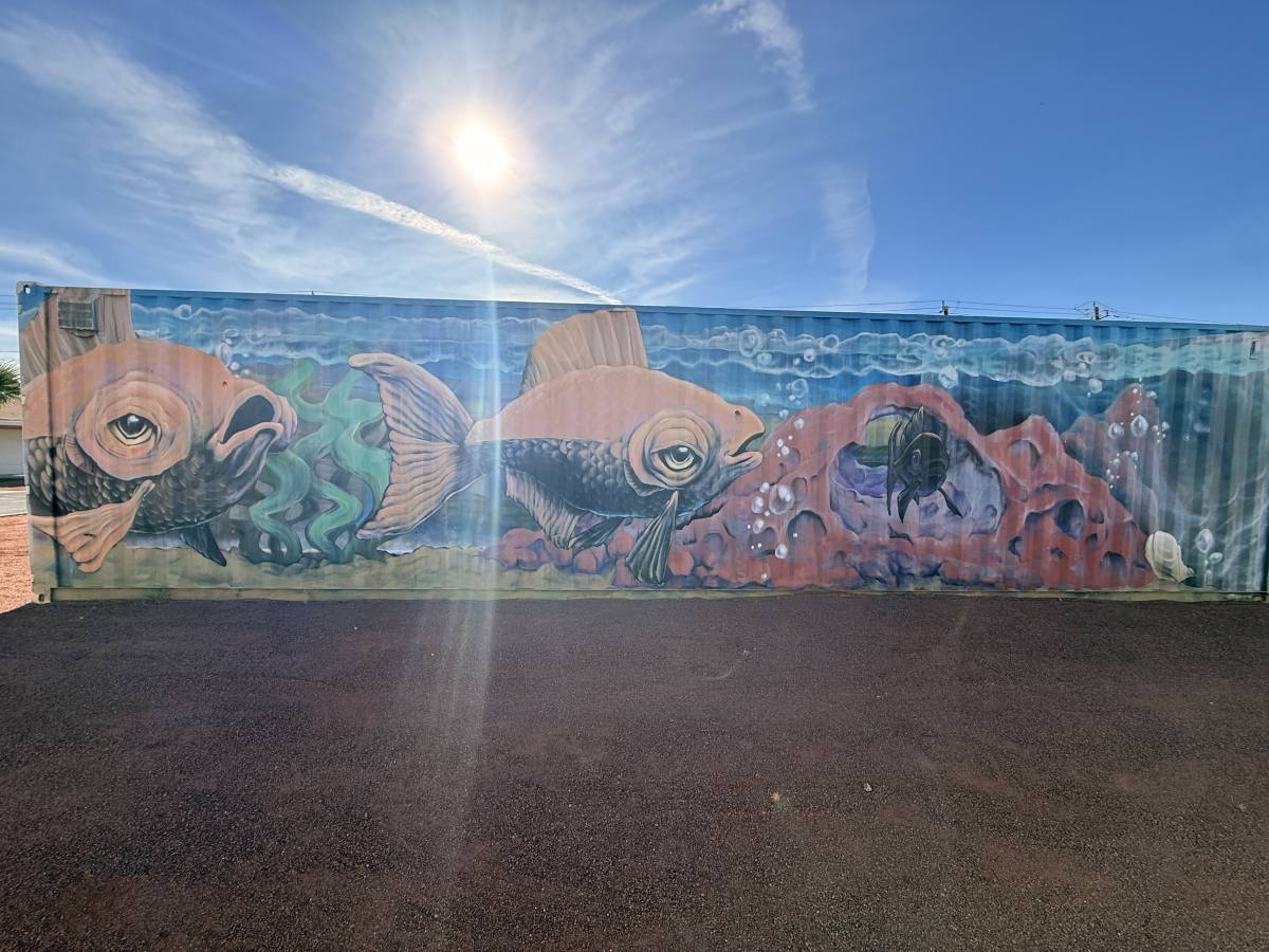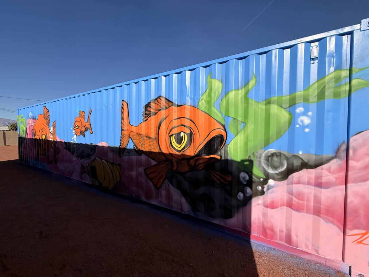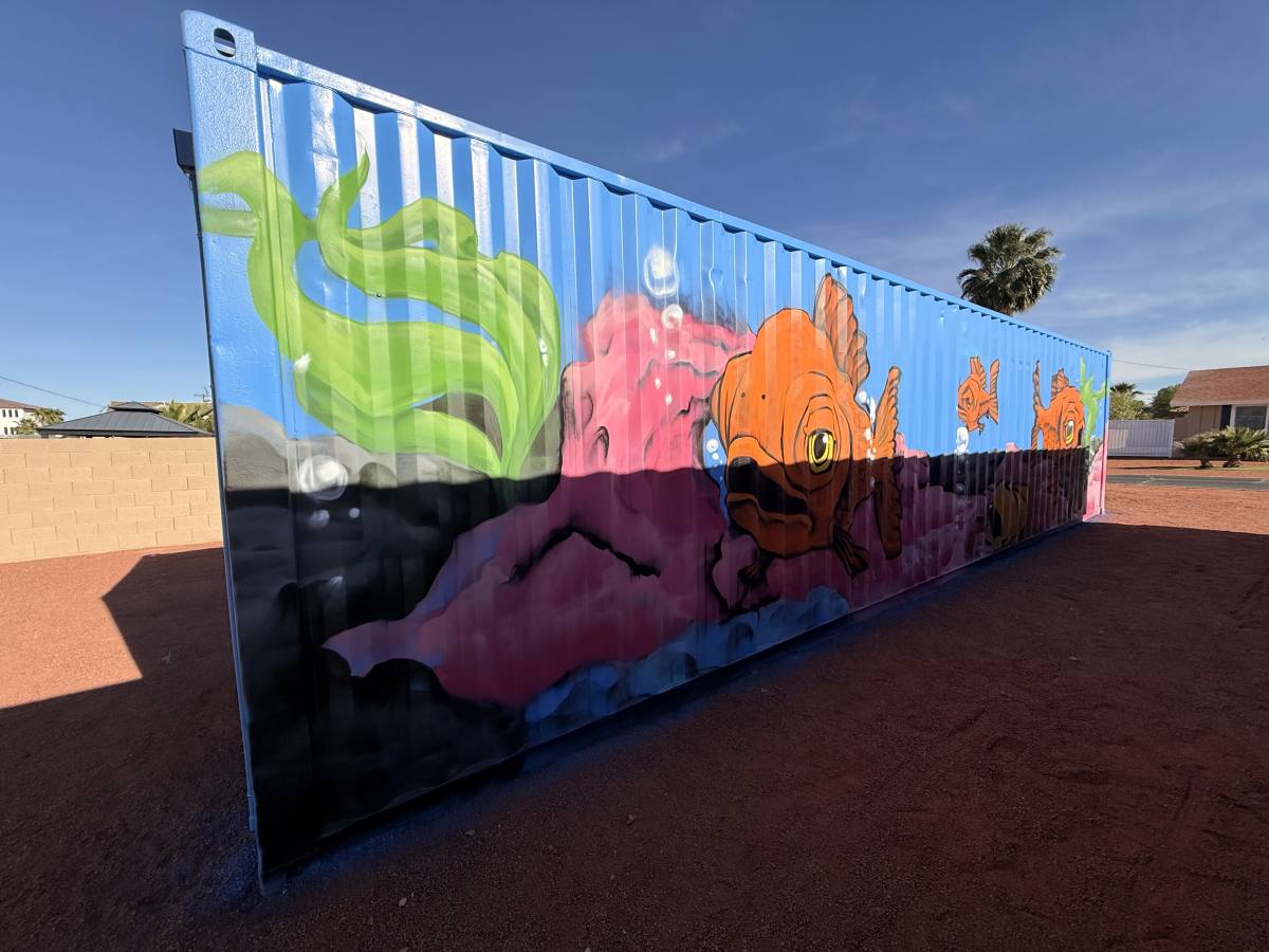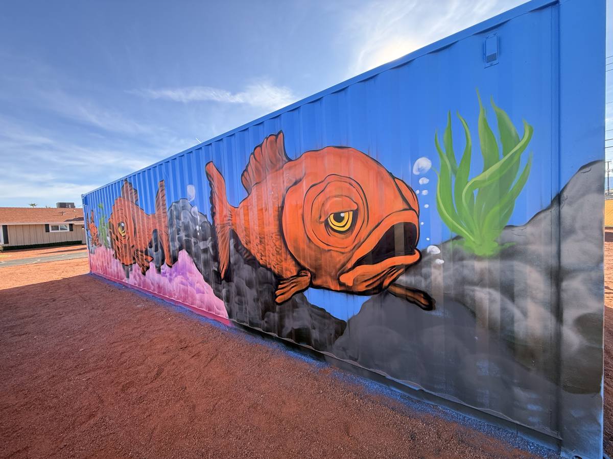 At a private residence, four corrugated storage containers were transformed from purely functional structures into a vibrant mural installation inspired by nature and water.
