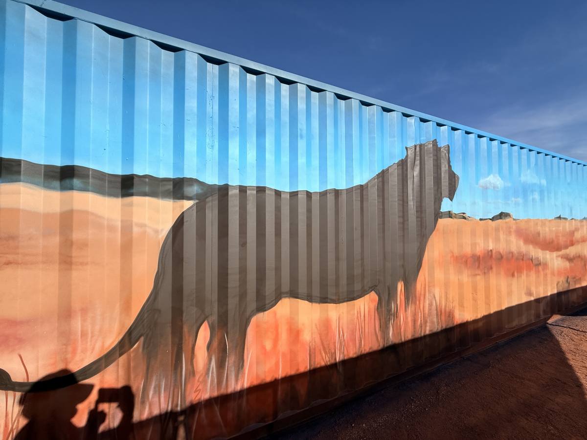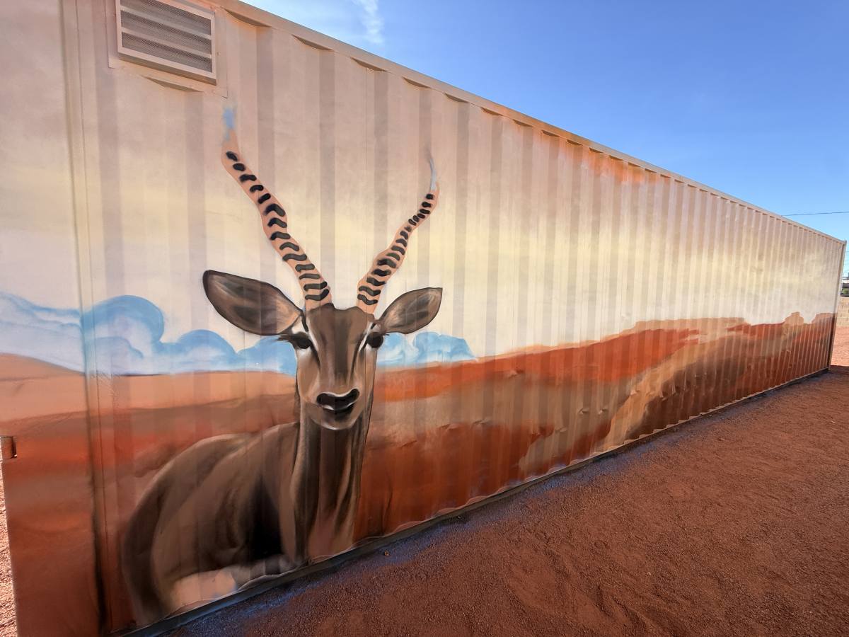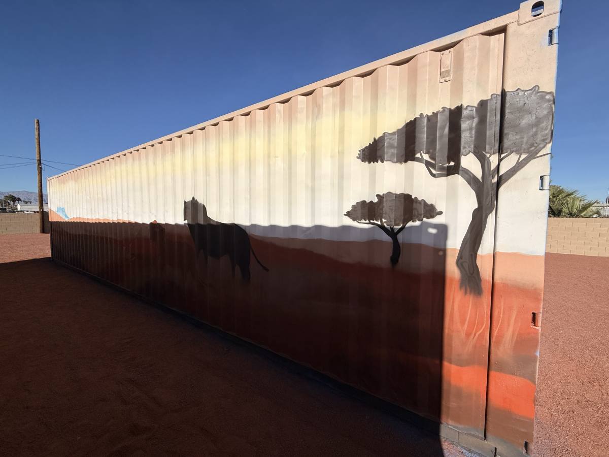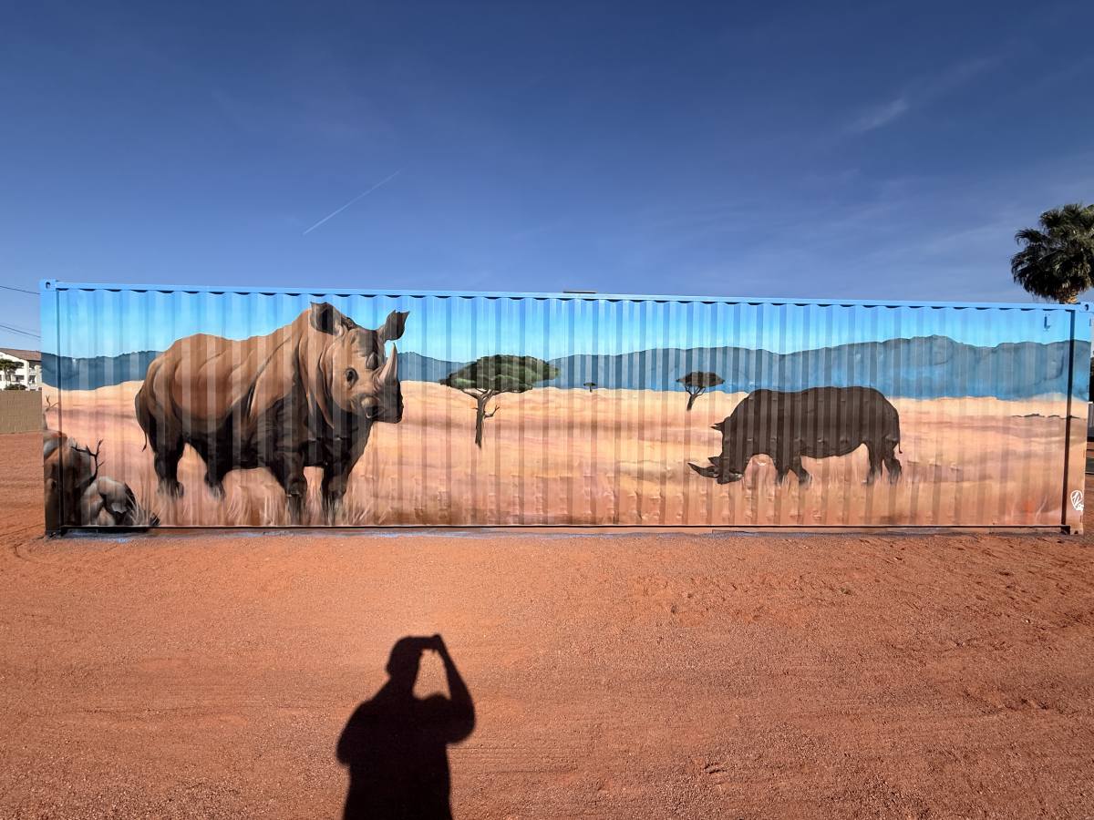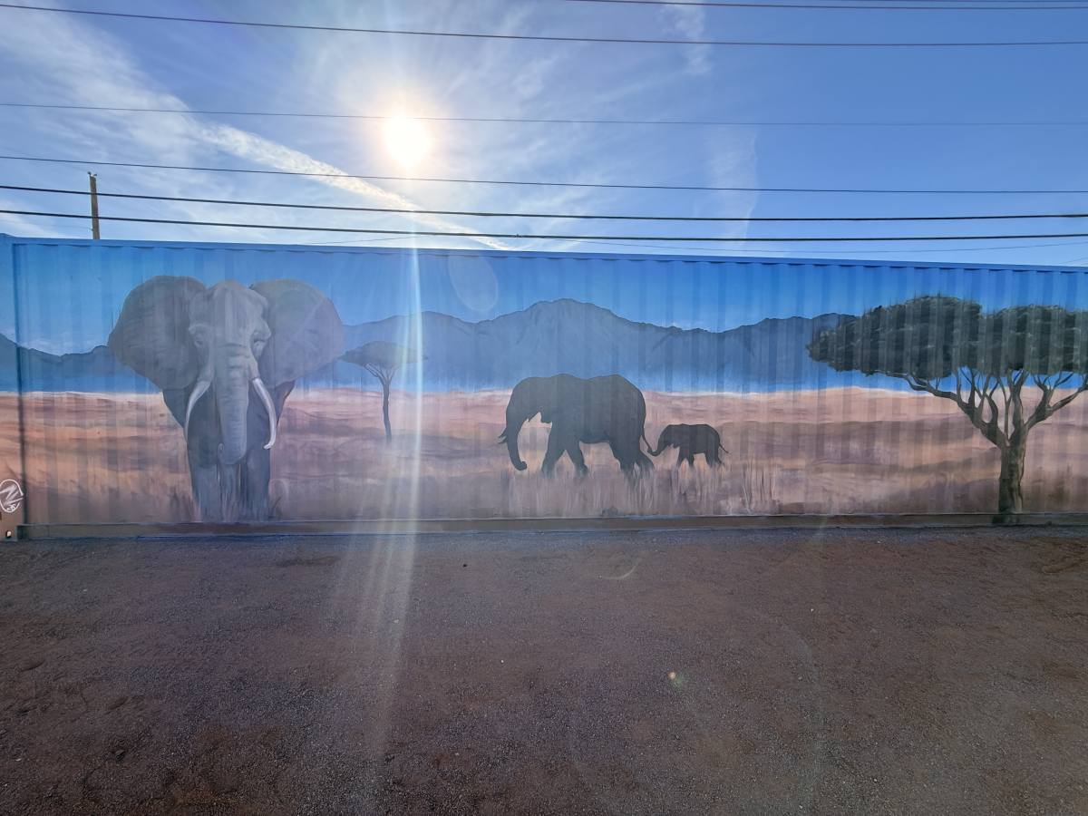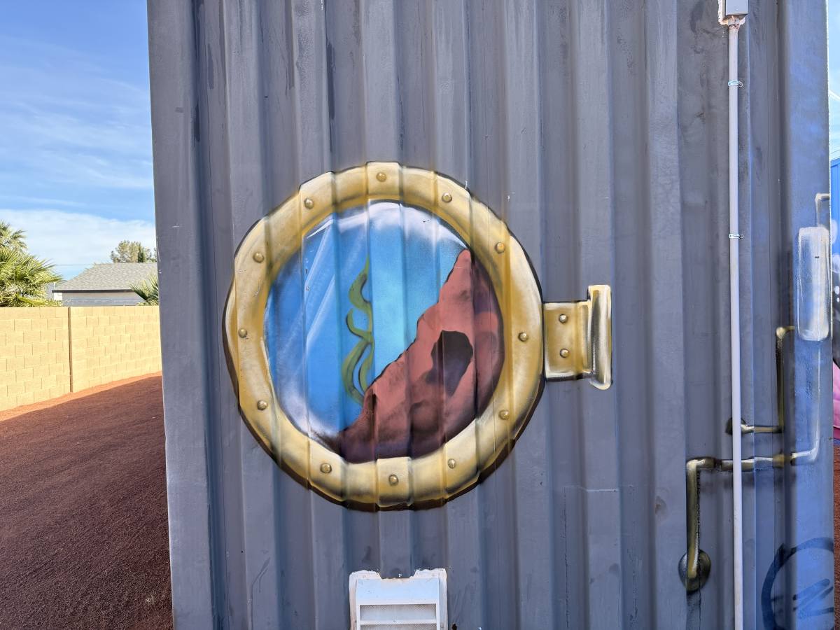 At a private residence, four corrugated storage containers were transformed from purely functional structures into a vibrant mural installation inspired by nature and water.